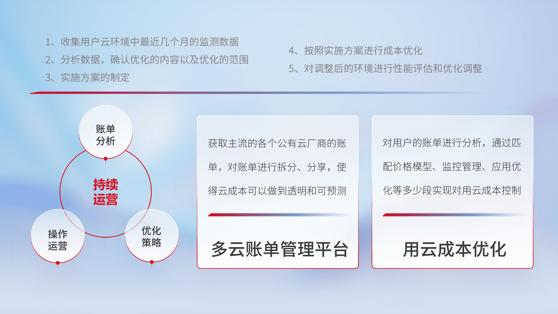 通过多云纳管,,,,以统一的资源数据模型把客户的云资源进行抽象和封装,,,进而实现对多云资源的统一操作,,,保障云资源管理的可靠性、、、、稳定性与可用性。。量身定制化运维内容,,配置、、开发运维、、、、补丁管理、、、备份、、监控、、、、认证和访问管理、、、审计和日常巡检等,,保障在用云过程中的可靠度,,稳定度以及高可用率。。