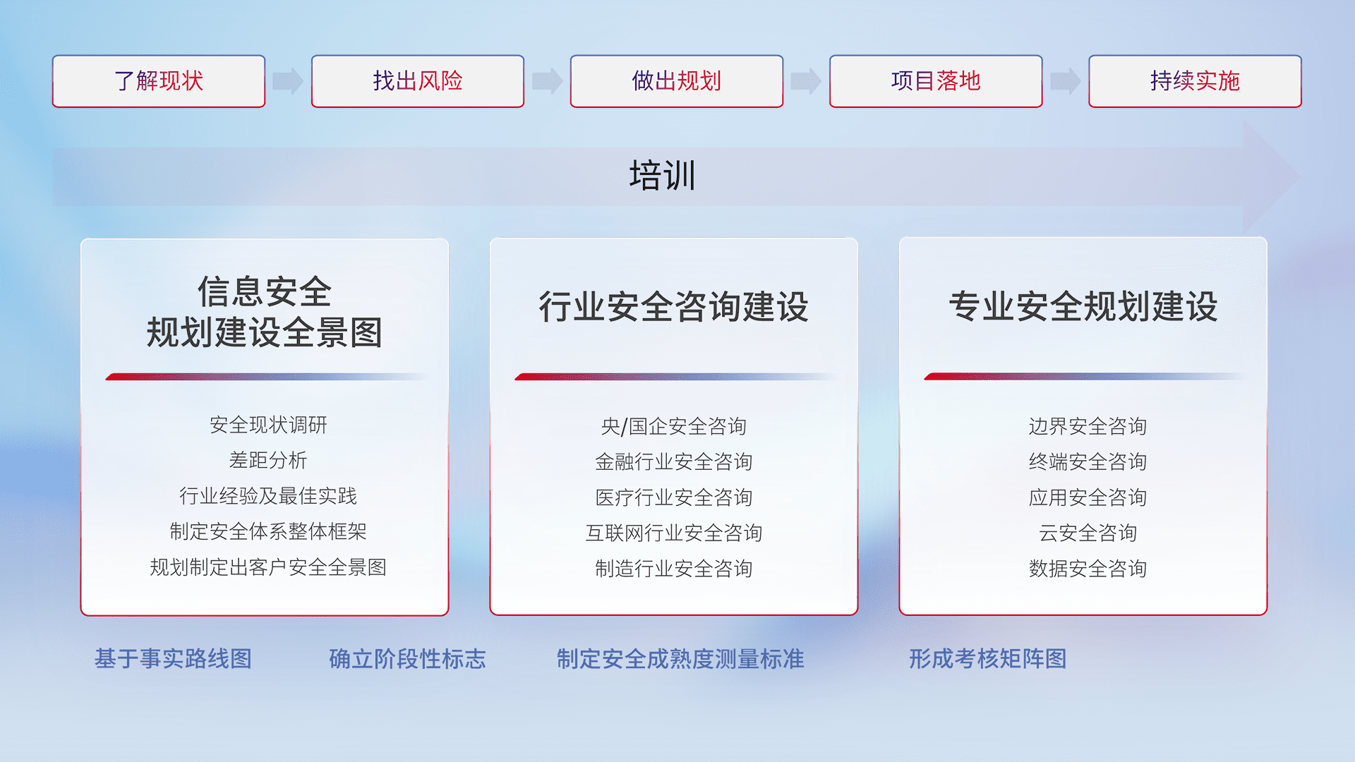 梳理客户信息安全现状调研、、差距分析结果,,,,结合行业先进经验及最佳实践,,,制订客户的信息安全管控体系总结架构,,,,最终形成一个完整的客户信息安全规划与建设的全景图。。。
