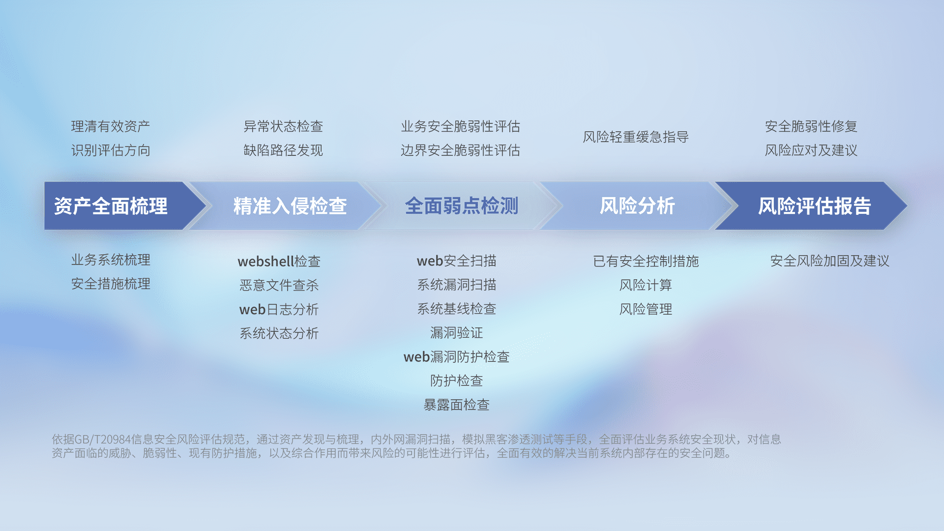 针对客户行业特性,,以专业的安全服务+多厂商联合解决方案提供专属的一站式安全管理服务,,,,帮助客户全面感知网络空间威胁,,,基于识别、、检测、、、分析、、防护、、监测、、响应的服务理论模型,,,从方案咨询、、、、集成交付、、、评估验证、、、优化加固、、、运维运营,,,,致力于为客户提供完整的闭环管理式安全服务。。。。以实战经验为客户打造高抵御风险的安全体系,,,帮助客户发现威胁、、、、对抗威胁、、处置威胁,,不断积累安全对抗能力,,持续保障数字化安全。。
