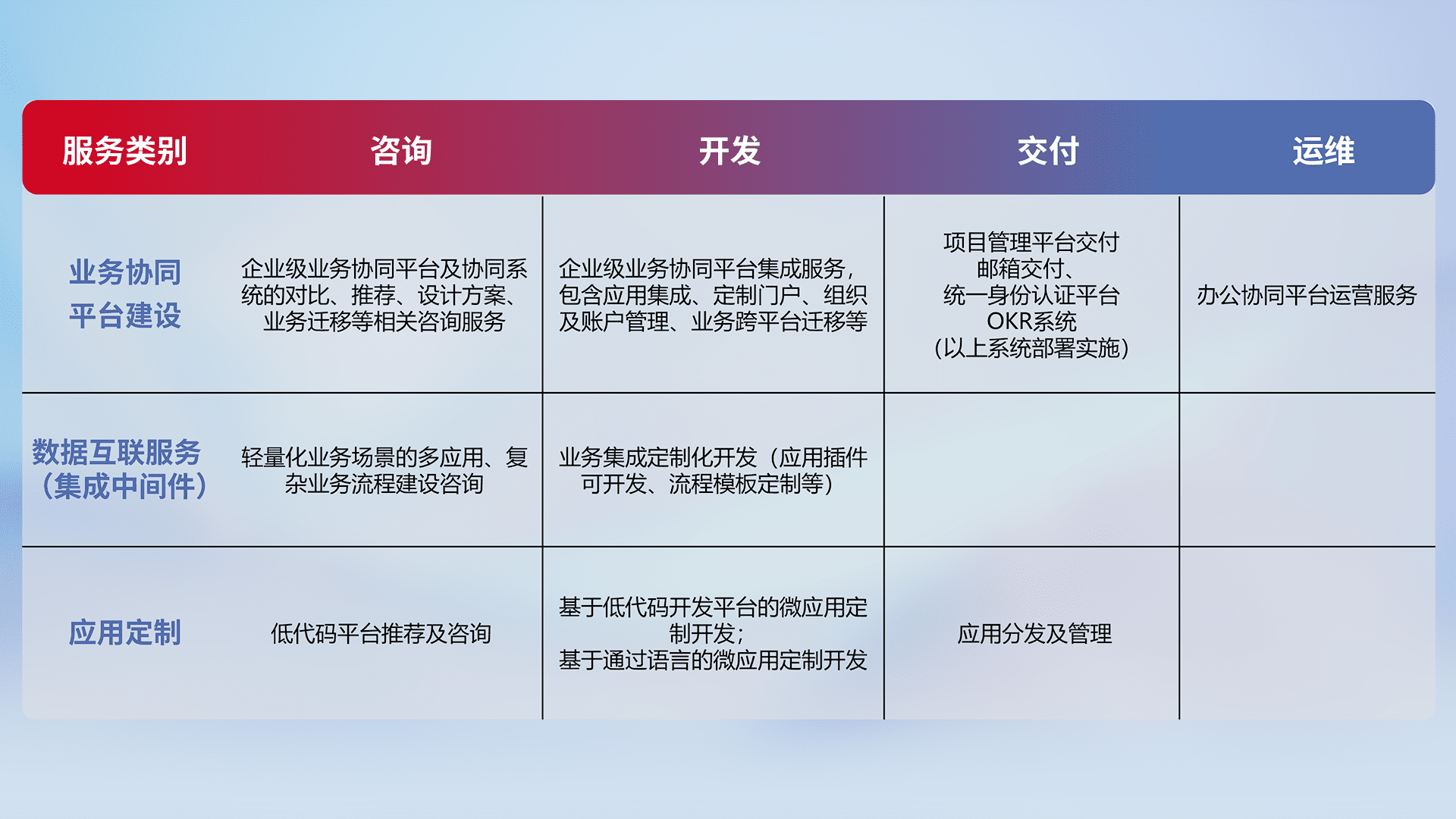针对钉钉、、、、企微、、、IDaas等平台级产品提供产品的规划、、方案、、、、交付、、、定制化开发等服务,,,,实现如统一协同办公、、、、智能客户服务、、混合会议管理、、、智能数据查询、、、等业务场景,,,,实现数字化转型。。。。